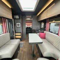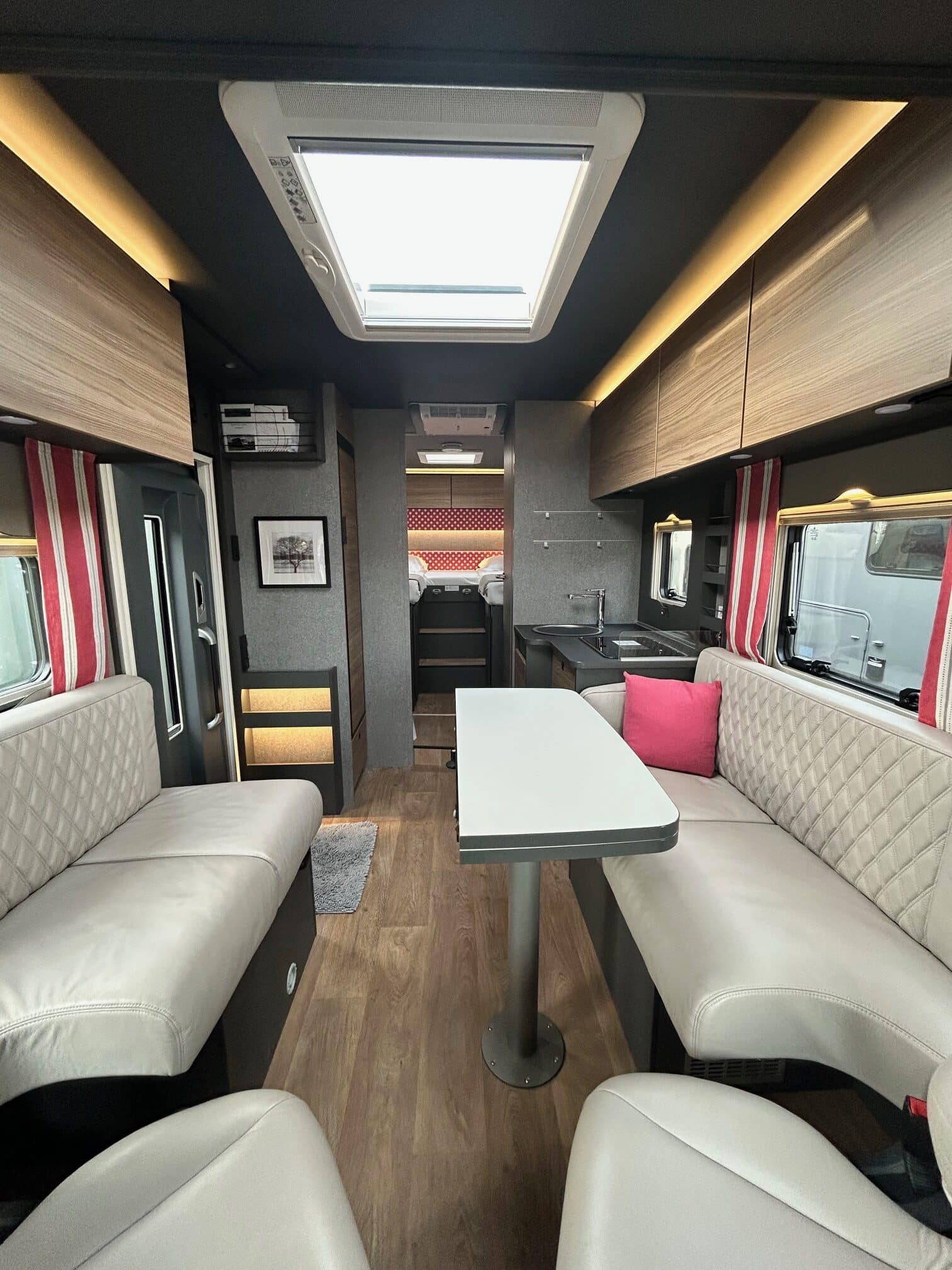 - Oak furniture and upholstered in a GlamperRV premium grey leather upholstery including Pilot front cab seats and living area seating.